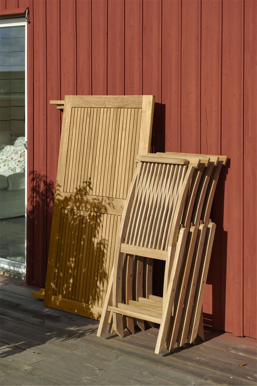 Teak ist von Natur aus ölreich und muss nicht geölt werden, wenn man nicht möchte. Es wird dann schön silbergrau. Wenn man die goldene Farbe bevorzugt, sollte man den Klappstuhl regelmäßig einölen. Um das beste Ergebnis zu erzielen, kann man Sie können dann zuerst ein wenig leicht in Richtung der Fasern schleifen, um die besten Ergebnisse zu erzielen.