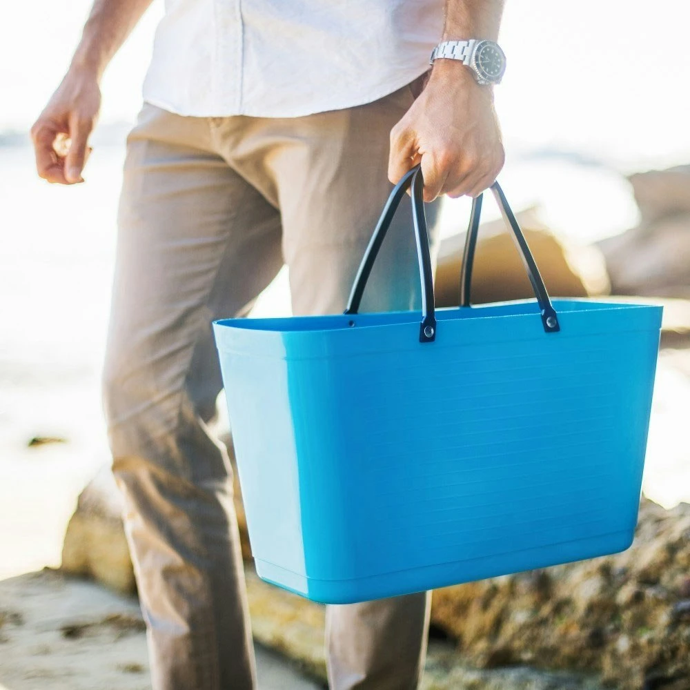 Hinzabag ist ein praktischer, stilvoller schwedischer Klassiker dessen Anwendungen allein durch die Vorstellungskraft begrenzt sind. Die Tasche hat eine offene, stabile Konstruktion, die ein Gewicht von bis zu 15 kg unterstützt. Die Tasche ist mit richtigen Handgriffen ergonomisch gestaltet und der Tragegewicht liegt nahe am Körper, wodurch Rücken und Schultern geschont werden. Die Tasche besteht aus strapazierfähigem, recycelbarem Polyethylen-Kunststoff mit Nieten aus vernickeltem Messing. Die Gesamthöhe der Tasche mit Griffen beträgt 42 cm. Die klassische Tasche wird von Männern wie Frauen, jung und alt geschätzt. Die Tasche ist stapelbar und wasserdicht und lässt sich einfach mit fließendem Wasser reinigen.